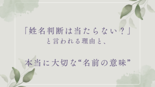 姓名判断は当たらないと言われる理由 「姓名判断は当たらない?」と言われる理由と、本当に大切な“名前の意味” 「姓名判断は当たらない?」と言われる理由と、本当に大切な“名前の意味”こんにちは、お名前に宿る光をひも解き、魂の輝きを引き出すれみです。「姓名判断なんて当たらない」「名前で何がわかるの?」――そんな声を耳にしたことはありませんか?実際に、姓... 2025.10.02 姓名判断は当たらないと言われる理由麗耀姓名判断